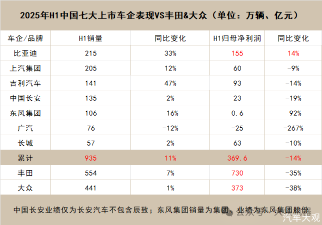 8月底,中国七大上市车企集团(前十大车企集团排名中),比亚迪、上汽集团、吉利汽车等车企的半年成绩正式公布。