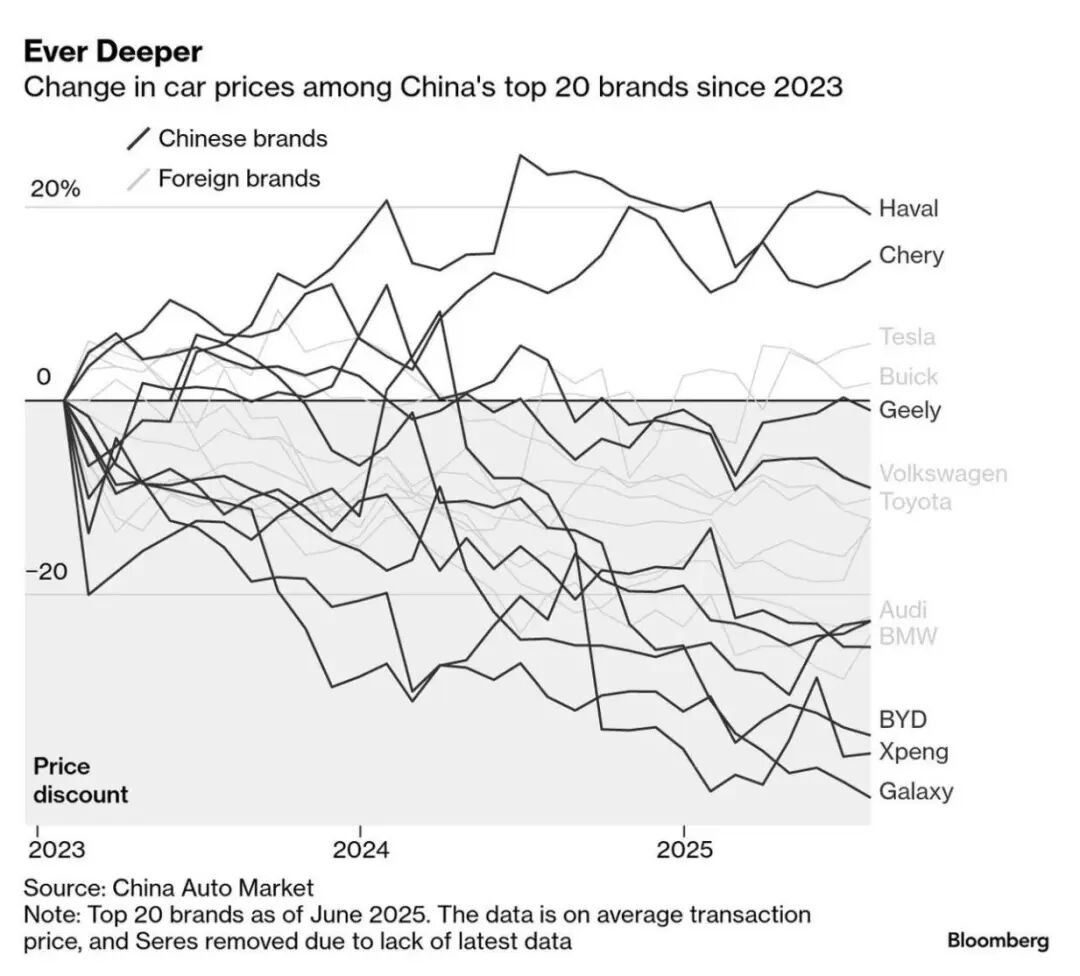 这种现象也引起彭博社的关注,彭博社刊出了一篇《中国汽车制造商在很大程度上忽视了国家关于结束激烈价格战的呼吁》,其认为中国汽车市场激烈的价格战仍在持续,政府旨在平息竞争的举措收效甚微。彭博社的表格中显示,7月份中国排名前20的汽车品牌基本均维持或加大了折扣力度,比亚迪等本土品牌的平均成交价继续下探。