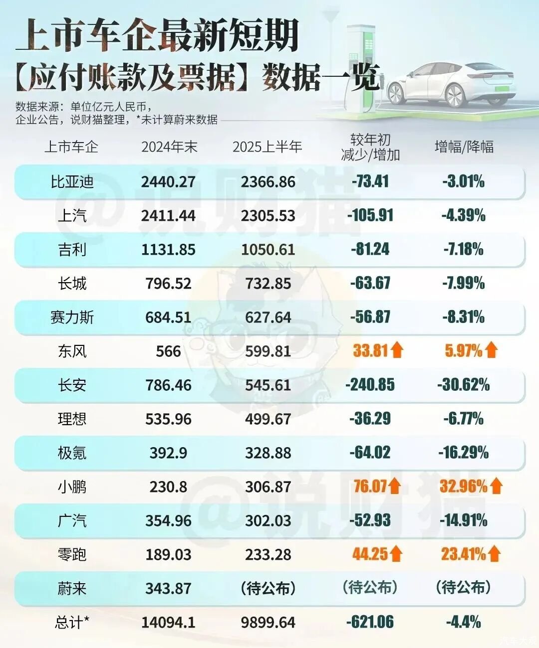 通过12家上市车企财报中的“应付账款和票据”能发现,应付账款及票据比年初,总共减少621亿。长安少了240.85亿最为豪爽,其次是上汽清了105.91亿,吉利少了81.24亿排第三。3家车企的“应付账款和票据”是上升的,小鹏增加76亿;零跑增加44亿;东风汽车增加34亿。小鹏、零跑的应付款上涨能理解。毕竟上半年这俩车企的交付量猛涨,卖车多了,欠下供应商的体量自然也就多。