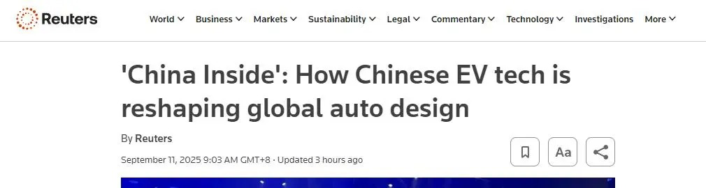 9月11日,路透社一篇题为《中国芯:中国电动汽车技术如何重塑全球汽车设计》的文章认为,得益于创新制造工艺,中国的电动汽车公司能够比老牌竞争对手以更快的速度、更低的成本推出新车型。