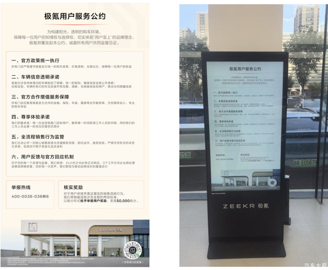 今年8月,极氪做了几件业内极其罕见的事。以公告的形式对外公布了接下来的产品更新计划,让用户能提前掌握更多信息,结合自身需求选择合适的购车节点。如果你最近去过极氪门店,会在最显眼的位置看到《极氪用户服务公约》,把售后、权益、保值相关的规则标准化,在全国门店公开展示,降低信息不对称。