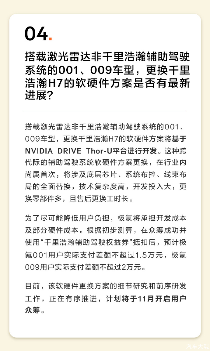 对于老车主,极氪更拿出真金白银来改善体验。譬如,面对老款极氪001、009车型的辅助驾驶问题,极氪给出的解决方案是,投入数亿成本重新开发切换方案。从Mobileye方案更换为搭载Thor芯片的自研千里浩瀚方案,这应该是行业首次跨代际的辅助驾驶系统更换升级。