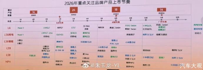 一张名为《2026年重点关注品牌产品上市节奏》的图片,展示了小米、鸿蒙智行、蔚小理、领克、极氪、零跑等多品牌的新车计划。这些新车中,增程的存在感肉眼可见。