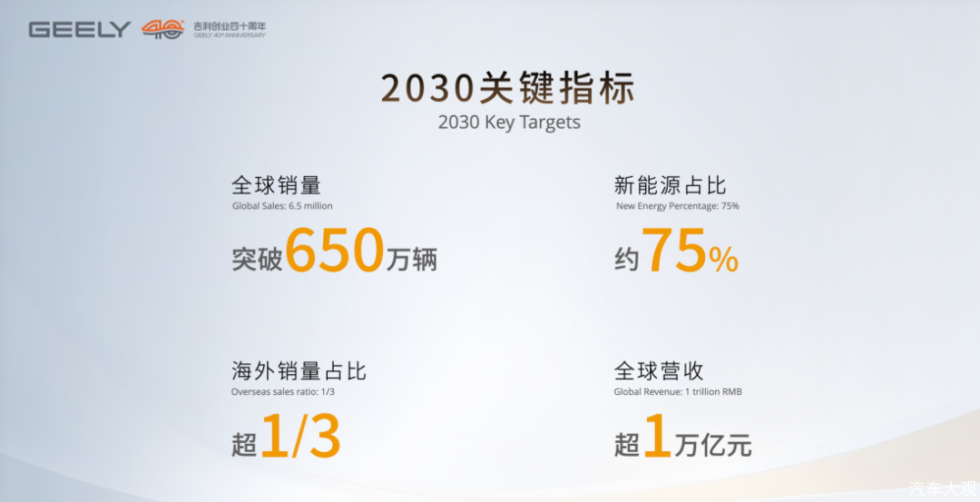 2026年,吉利在成立40周年之际开启全新篇章。吉利宣布2030年要实现乘用车加商用车全球总销量突破650万辆,营收超1万亿元,跻身全球车企销量前五。