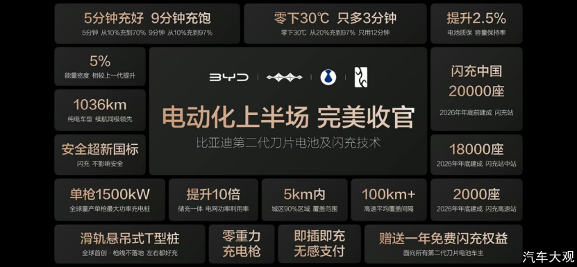 而比亚迪的这场颠覆性技术发布会,也已透露底牌:第二代刀片电池、兆瓦闪充2.0,从电池和补能两大核心直接收官电动化上半场,并且强调了技术的快速量产推广,一口气发布了旗下四大品牌的11款新车。比亚迪的路径更直接:用技术闪击战疯狂发起市场总攻,让普通消费者用亲民价格享受到顶级技术。