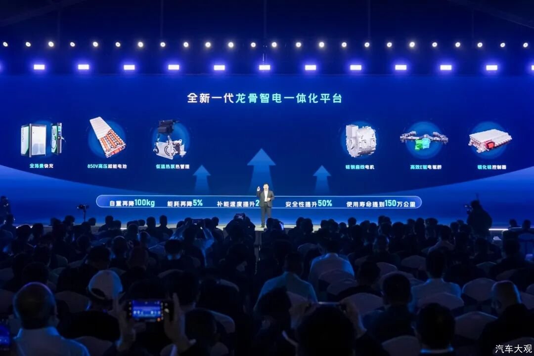 基于“龙骨”平台的集成整合优势,车辆自重能够再降100kg。此外,850V整车高压平台降低充放电损耗2%、提升补能速度25%,配合870马力低速大扭矩六相圆线电机(最高效区占比98.2%)和碳化硅(SiC)电控,以及低风阻设计,实现整车能耗在已领先行业20%的基础上再降5%。