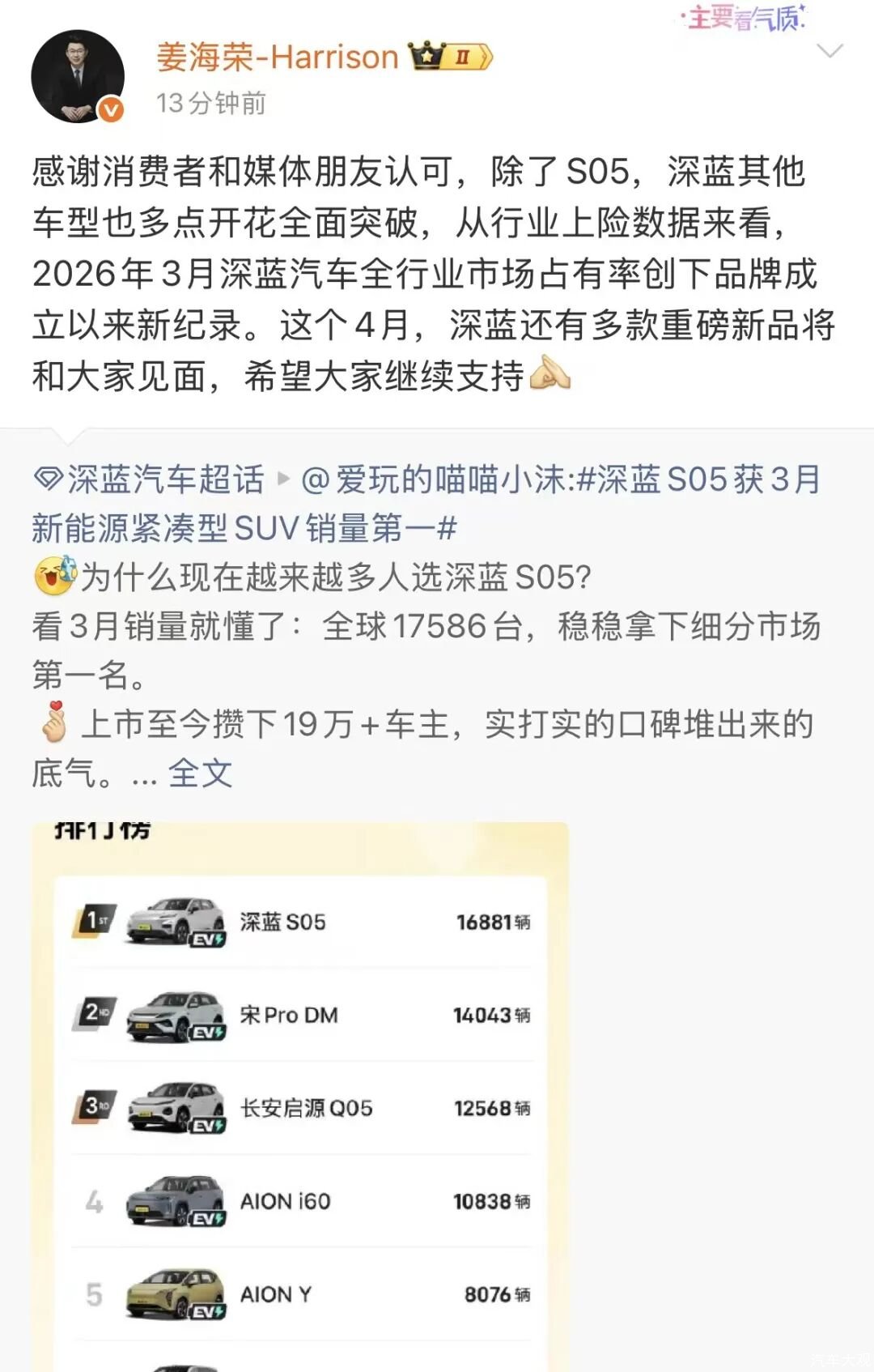 4月11日,深蓝汽车CEO姜海荣在社交平台转发了一张“2026年3月全国新能源紧凑型SUV零售销量排行榜”,深蓝S05以16881辆的单月销量,赫然位列榜首。姜海荣表示:“2026年3月,深蓝汽车全行业市场占有率创下品牌成立以来新纪录”,并透露4月还有多款重磅新品亮相。
