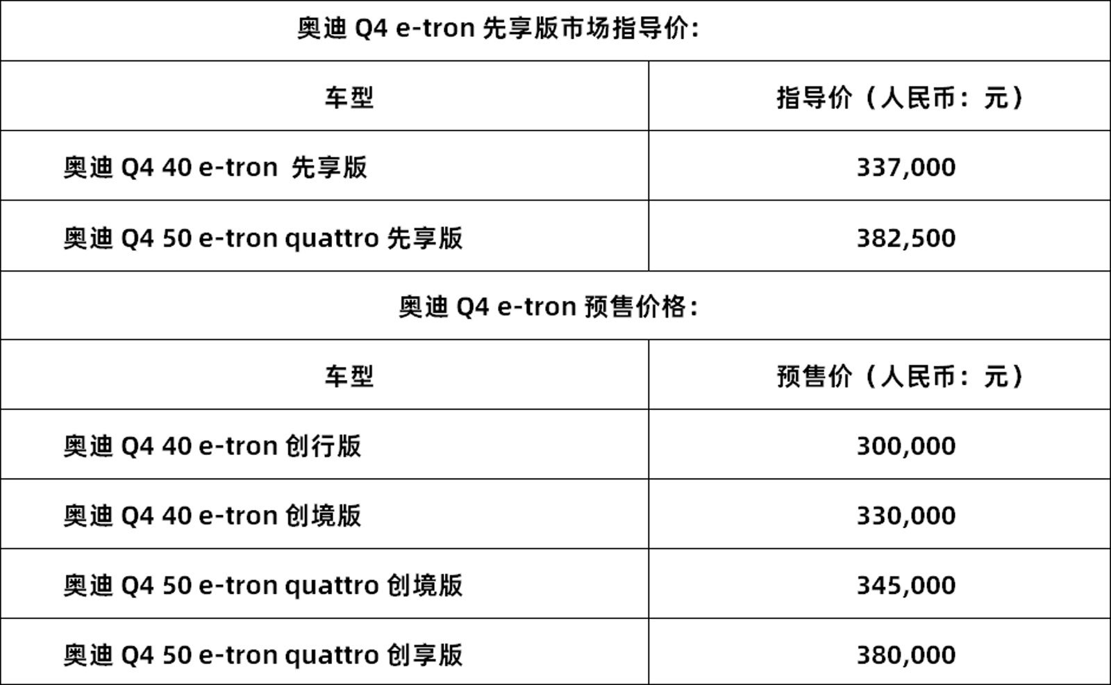2022年5月20日,“超A感受的真纯电豪华SUV”奥迪Q4 e-tron正式开启预售,价格区间为30.00万元-38.00万元。与此同时,限量520台奥迪Q4 e-tron先享版车型正式上市,价格区间为33.70万元-38.25万元。奥迪Q4 e-tron将凭借“真纯电、真豪华、真续航”的产品实力,30万级的超值价格,全新无忧的体验体系,为用户带来纯电豪华出行新体验。