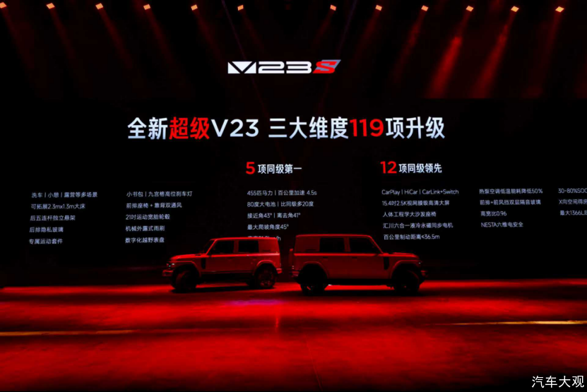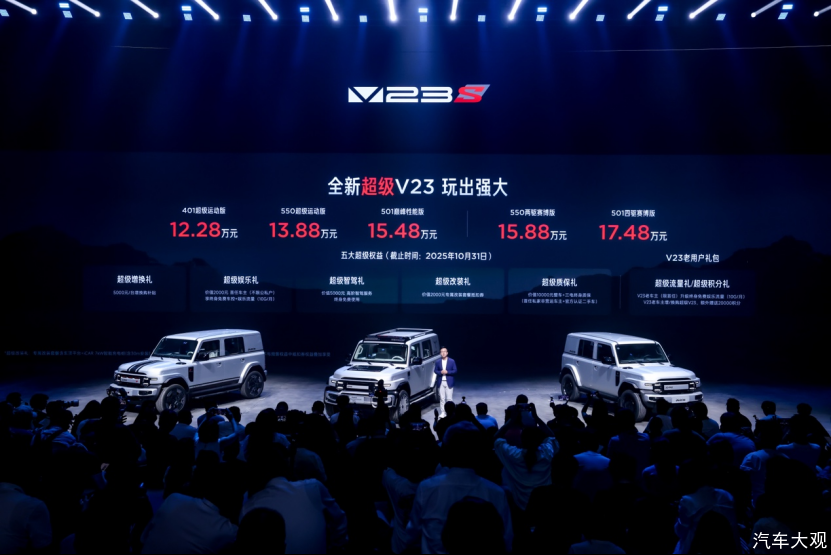 这也是此番V23产品升级,但造型“一刀不改”的原因。苏峻在上市现场称,升级后的全新超级V23,在“性能、操控、越野”等核心维度“脱胎换骨”。