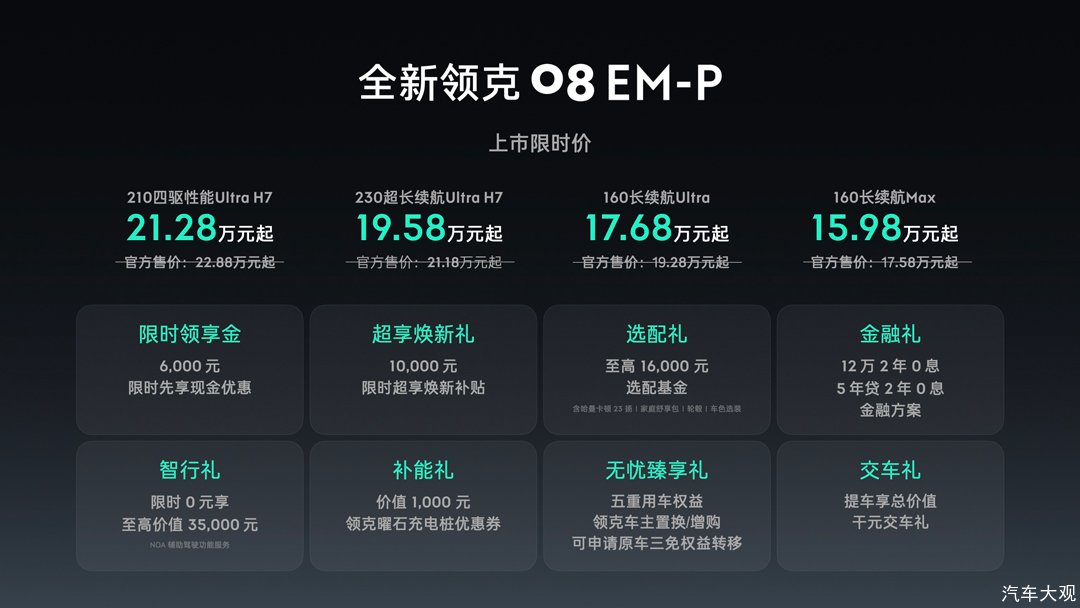 2025年9月24日,“家庭豪华智混SUV”全新领克08 EM-P正式上市。新车提供160长续航Max、160长续航Ultra、230超长续航Ultra H7、210四驱性能Ultra H7四款车型可选,官方限时价15.98万元-21.28万元。同时,伴随新车上市还有限时领享金、超享焕新礼、选配礼、金融礼、智行礼、补能礼、无忧臻享礼、交车礼在内的8重限时福利。