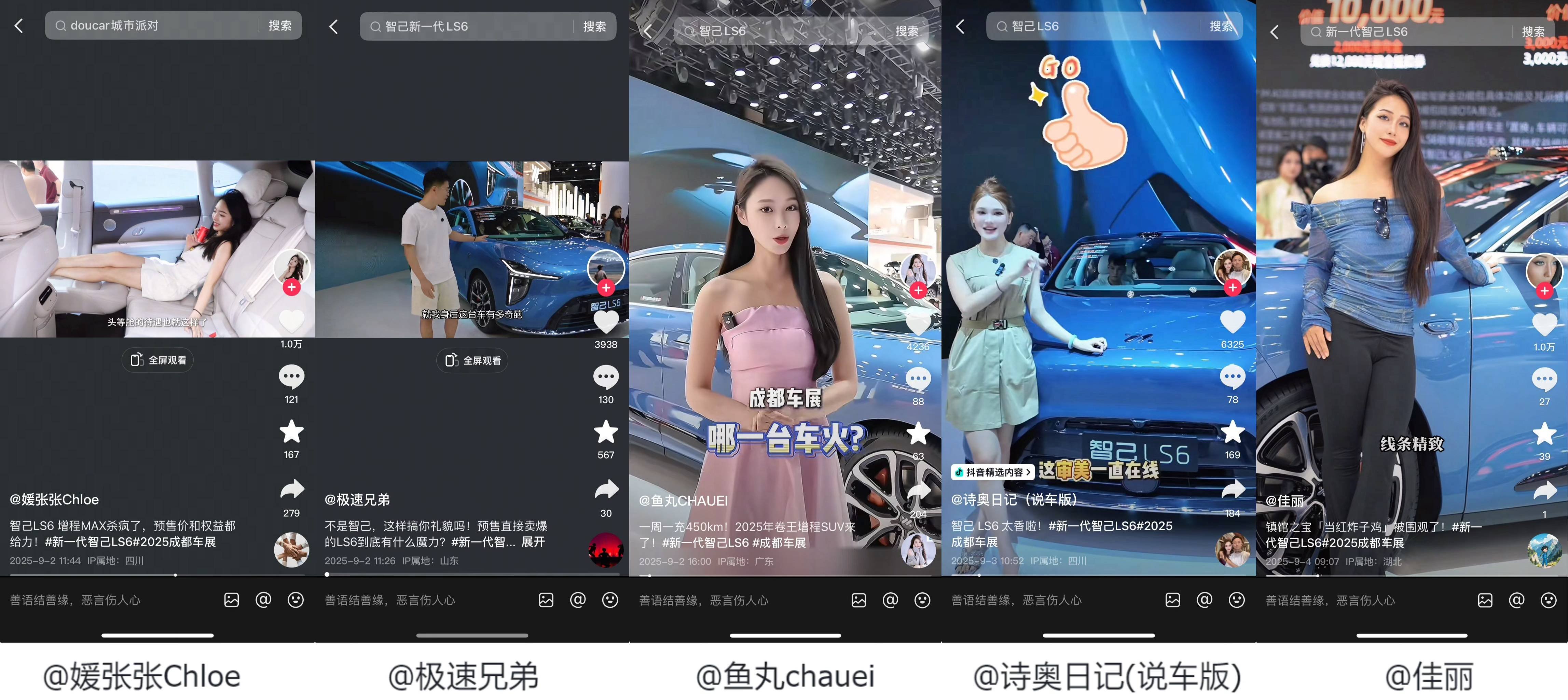 智己汽车带着首款全球车型“中大型智能轿跑 SUV” 智己 LS6重磅亮相成都车展。基于“DOUCAR城市派对”IP合作,平台官方集结众多达人组成探展小队,其中邀约10位百万粉丝达人前往智己展台直击LS6,他们深入成都车展核心区,实时直击最新动向,通过达人 “第一视角” 解读智己LS6的智能科技,将 “参数” 转化为前沿设计、专属好价等用户可感知的体验。智己LS6展台探展视频累计播放量超过400万,触达众多潜在兴趣人群和购车决策用户,为新车收获了一波精准曝光。