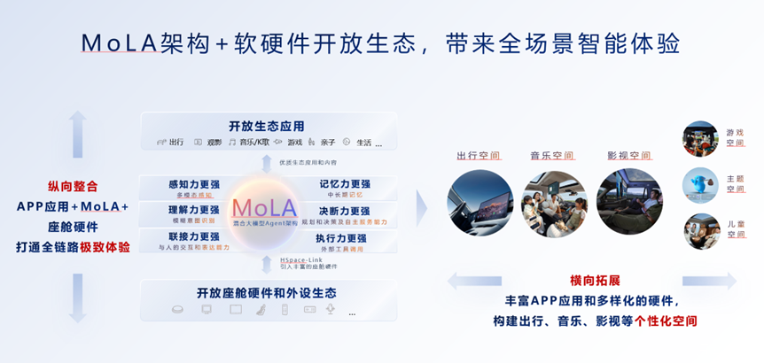 作为 HarmonySpace 5 起采用的核心架构,MoLA 通过融合多模态感知、通用大模型与垂域智能体,搭建起从用户意图到硬件执行的完整链路。其独创的全域免唤醒、导航三模式纠错等功能,让语音交互告别指令束缚。用户说 “车里有点暗” 即可开启阅读灯,导航时可随时改口调整目的地,彻底实现口语化控车。