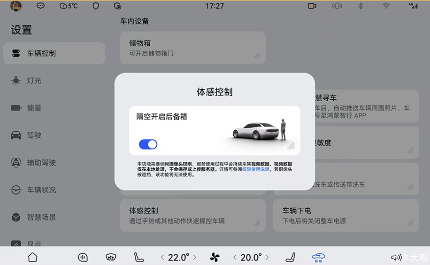 舒适性体验升级精准直击每一个用车痛点,让每一次出行都倍感惬意。新增“脚踢开启后备箱”功能,车主站在车尾正后方50cm处,抬腿离地20cm并收回即可开启后备箱,双手提物时更显便捷。“人走座停”功能可在用户临时离座后自动关闭座椅通风等功能,兼顾舒适与节能。针对老款车型,新增车内隐私保护功能,支持一键关闭麦克风、摄像头、定位等,守护用户隐私;“光随影动”功能让氛围灯颜色随视频内容实时变化,大幅提升观影沉浸感。