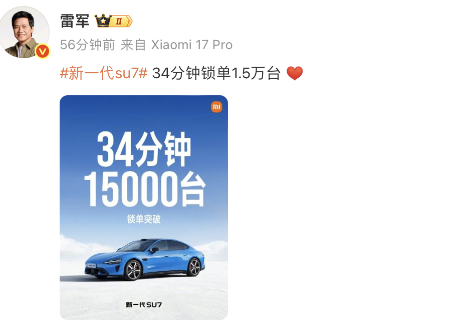 发布会结束不久,雷军又发了一条微博:新一代SU7,34分钟锁单1.5万台。