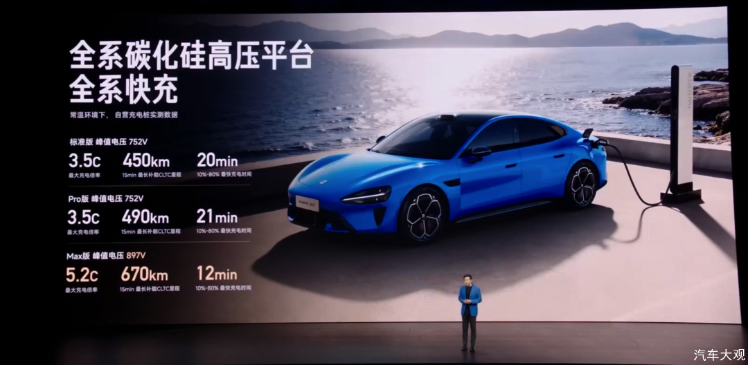 比如电子电气架构,新一代SU7标准版和Pro版升级到了752V碳化硅高压平台,其中 Pro 版匹配一块96.3 kWh的电池CLTC 综合续航达到902 km。Max版则搭载897 V碳化硅高压平台,在常温环境下,使用小米自营超充桩实测,15分钟最快可补670km的CLTC续航。