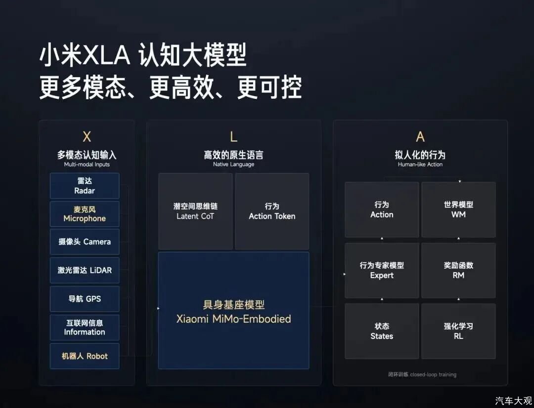 此前常被认为是小米汽车短板的辅助驾驶部分,新一代 SU7 这次采用了全系统一配置的策略。新车升级了“小米 XLA 认知大模型”,引入多模态输入,并结合具身基座模型,主要提升的是辅助驾驶系统在决策层的处理能力。