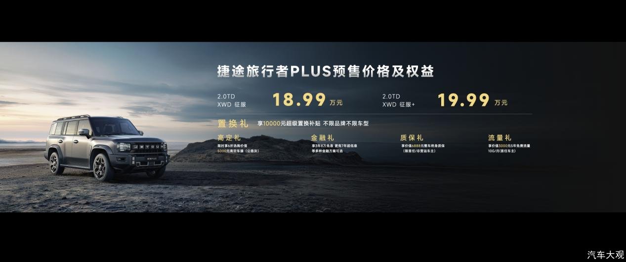 捷途旅行者PLUS,官方指导价18.99-19.99万元。捷途旅行者PLUS C-DM,官方指导价19.99-20.99万元。同时,捷途汽车还为消费者带来多重购车权益: