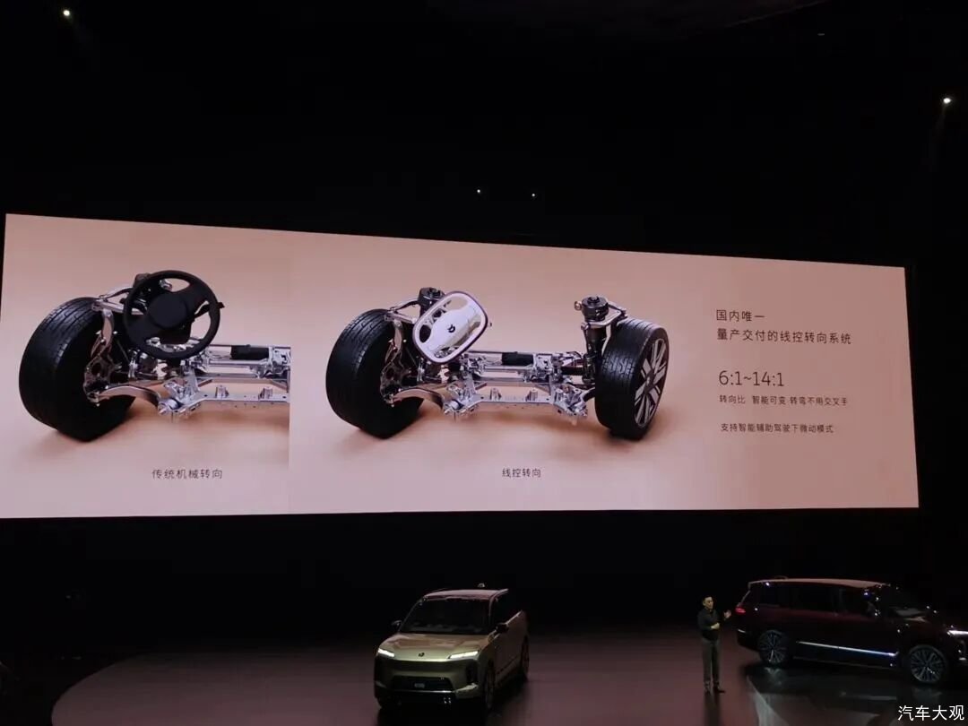 ES9 标配了后轮转向和线控转向能力,行政签名版还拥有天行全主动悬架(低配为双腔空悬+外置阀 CDC),除了能配合道路预瞄主动抑制车身晃动,其最大上行行程达到 60mm。ES9 在低速掉头的时候,方向盘只需要打半圈就到头了,且转弯半径只有 5.4 米。