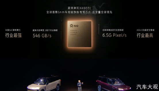 如今,神玑NX9031是全球首款采用5nm车规工艺的量产智驾芯片,ES9配备了两颗神玑NX9031自研芯片,整体算力约为2000TOPS。李斌对这颗芯片也相当自信:“在很长的时间里,都会是智能辅助驾驶芯片里综合能力最强的。”