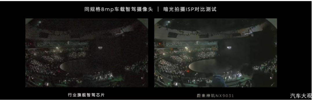 ES9全车搭载3颗激光雷达,覆盖前后左右全向感知,加上高清摄像头阵列和毫米波雷达,传感器总数超过33个。为了展示感知能力,李斌现场还用车载摄像头,拍了张照片,进行了对比。