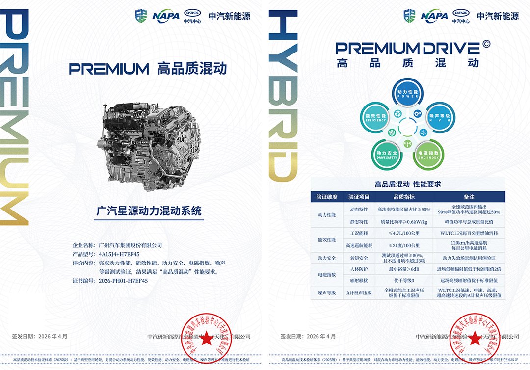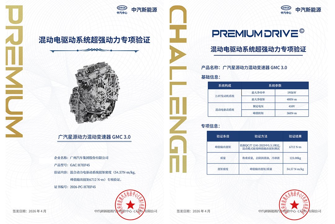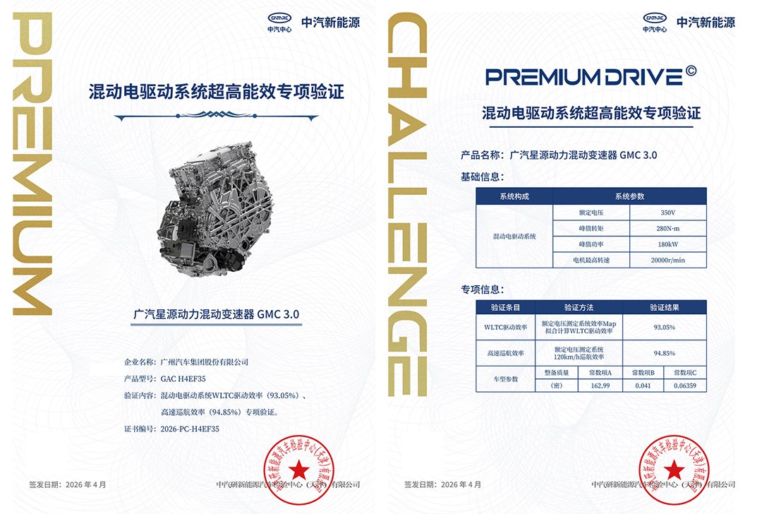 GMC 3.0混动变速器疾风版为国内首个重量低于100kg的轻量化DHT,整机仅重98.5kg,WLTC工况驱动效率达93%,最高传动效率98.7%,电控效率更以99.2%提前达成《节能与新能源汽车技术路线图》设定的2035年目标。配合广汽自研AI能量控制平台,系统可实时判断路况与驾驶习惯,自动切换最优能源模式,让搭载该系统的B级MPV油耗迈入3升时代,A级轿车油耗迈入2升时代。