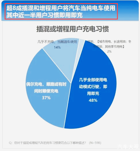 现阶段,混动车能够在中国市场占据一席之地,与消费场景息息相关。在市区上下班,它可以像纯电车一样,安静、平顺,而且电费可比油费便宜多了。周末想带着家人自驾游,跑个几百公里长途也没问题,但重点是,实际上有80%的插混车主,用车的时候就是当纯电车开的。绝大多数开混动的车主只要不是长途,通常都会使用纯电。