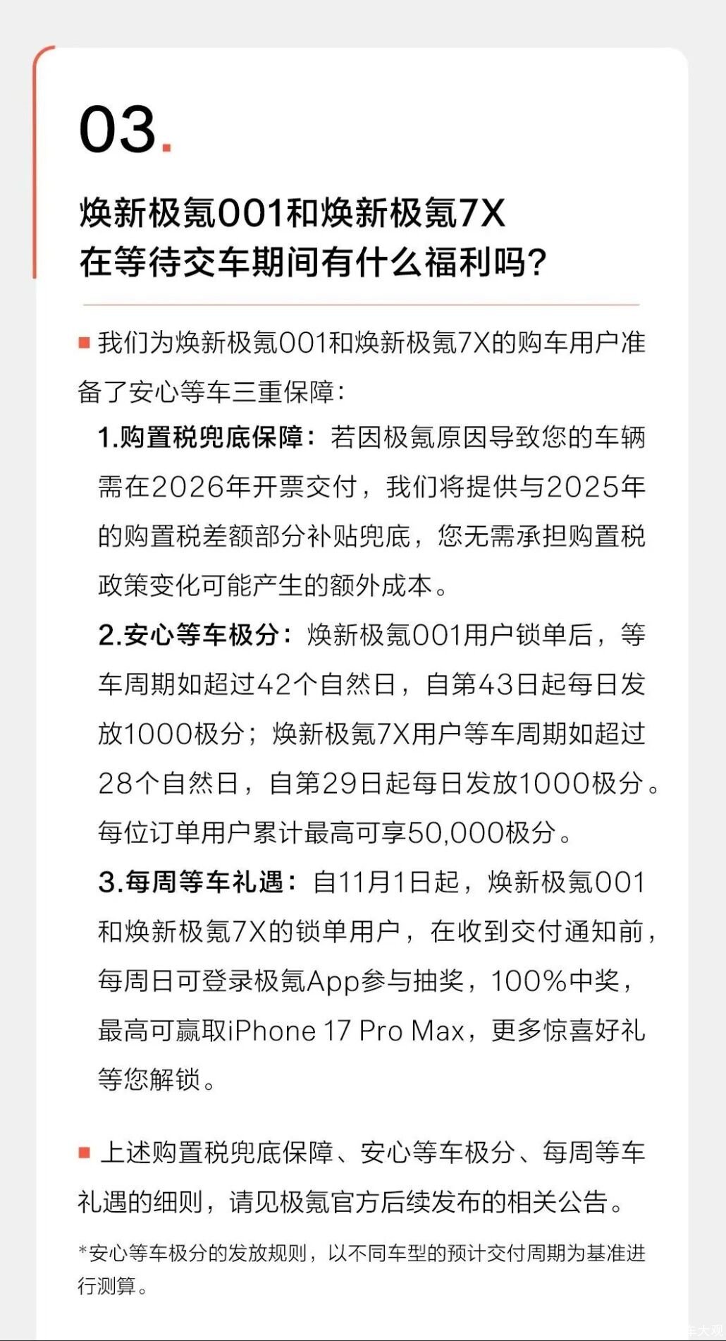由于政策原因,很多消费者选择在今年提前购置新能源车,这也让极氪9X、焕新001、焕新7X订单激增,面临供不应求的“甜蜜烦恼”,为了让大家安心等车,除了加紧与供应商协作,极氪还选择用购置税政策为用户兜底,用等车极分量化用户等待,用每周礼遇带给用户惊喜,据了解,每位订单用户累计最高可享50,000极分(相当于5000元)。
