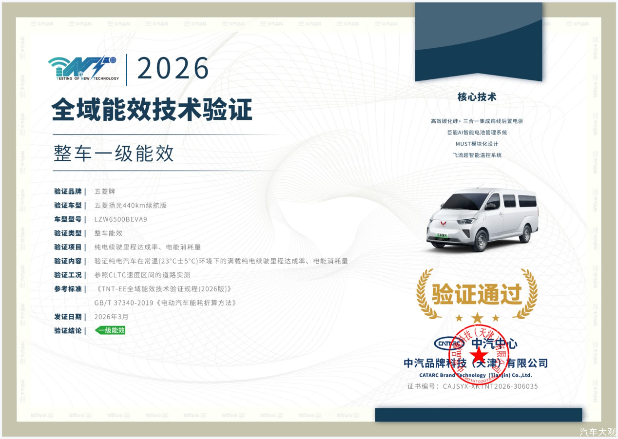 三大技术底座并非孤立存在,它们共同构成了五菱红标的“高效护城河”。这套技术体系不仅让2026款五菱扬光荣获了中国汽研能效认证等级1级证书,更让它成为了行业标准的定义者,而非跟随者。