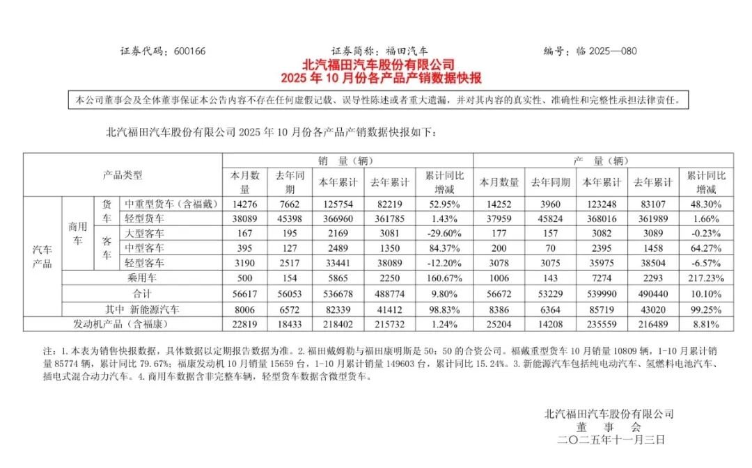 逆境之下,福田汽车最新发布的2025年10月产销快报却逆势增长。数据显示,福田汽车1-10月累计销量已达53.67万辆,同比增长9.8%。新能源车型表现尤为亮眼,前10个月累计销量达8.23万辆,同比大幅增长98.83%,几乎实现翻倍增长。其中新能源卡车累计销量达65465辆,同比增长130.1%,行业第一。