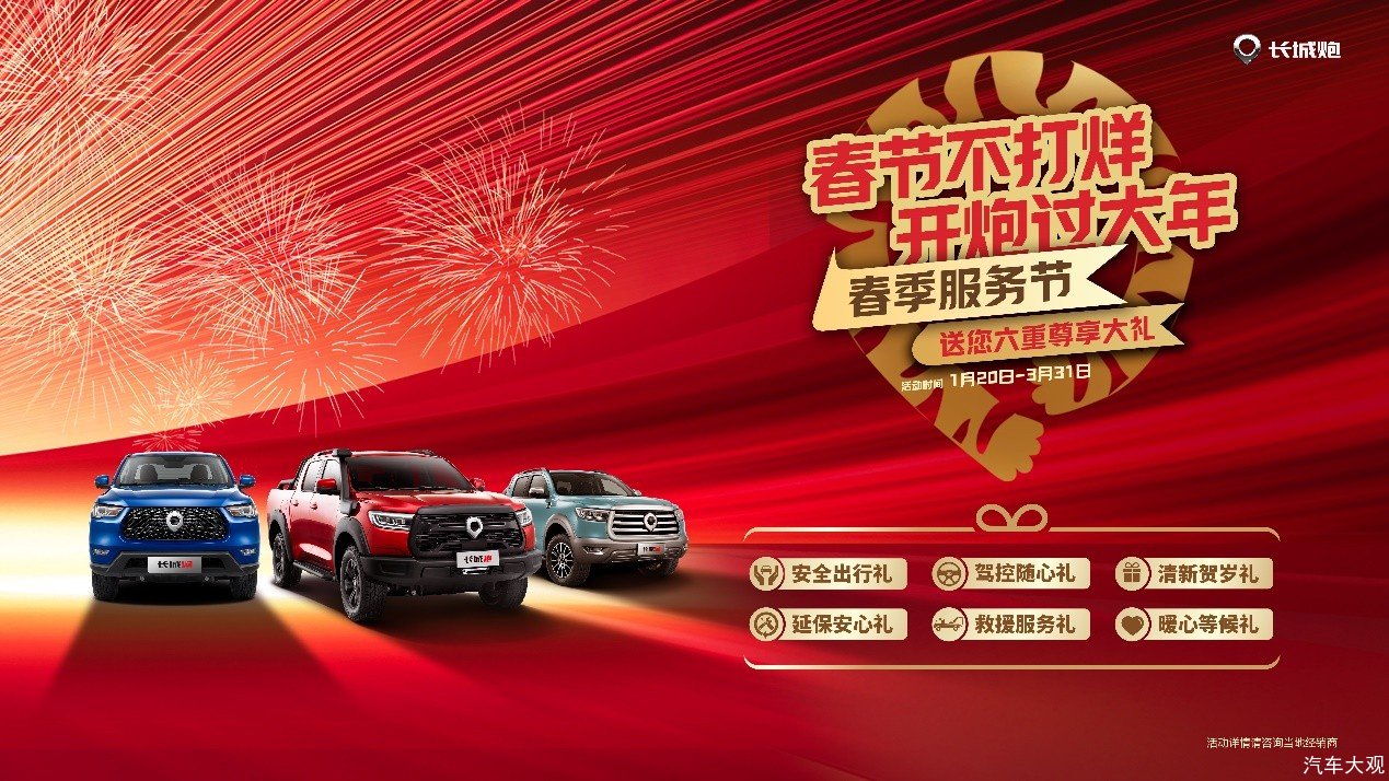 春节假期将至,自驾成为众多车主的返乡交通方式。为护航春节回家路,长城皮卡全系车型开展“春节不打烊,开炮过大年”春季服务节活动,并联动全国经销商,为客户提供安全出行礼、驾控随心礼、清新贺岁礼、延保安心礼等六重关爱服务。据悉,活动时间从1月20日持续至3月31日。
