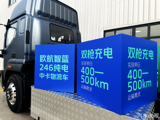 欧航智蓝ER246度纯电中卡适用于仓到仓之间的快递短驳运营细分工况。其搭载宁德时代电池,电池容量达到246.68kWh。在满载工况下,可实现近300公里的续航里程,可以轻松完成从上海到无锡之间的往返运输。