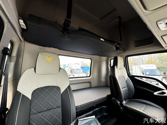 主副驾驶座位之间节省出来的额外空间可以摆放小储物箱,方便存放日常运营所需的餐具、衣物等生活用品。座椅后方的双卧铺设计,能在卡友午休时提供宽敞舒适的休息空间,并且下卧铺可拓宽至940mm,满足两个人同时躺卧休息。