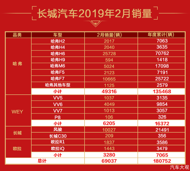作为中国SUV“领头羊”,今年2月,长城汽车旗下SUV车型共销售55521辆,同比大涨9.51%。其中,“中国SUV全球领导者”哈弗品牌销售近5万辆,达到49316辆,同比增长16.95%。