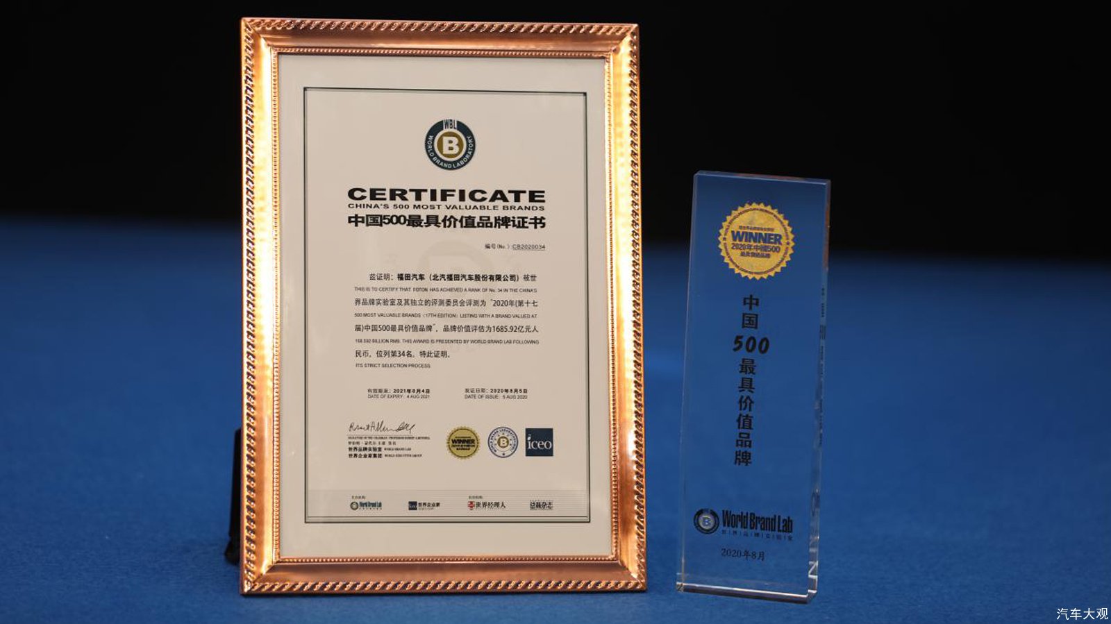 8月5日,2020年第十六届世界品牌大会暨2020年(第十七届)中国500最具价值品牌发布会在北京举行。其中,福田汽车品牌价值再创新高,突破1600亿元,以1685.92亿排行第34位,连续16年位居商用车行业第一、汽车行业第四。