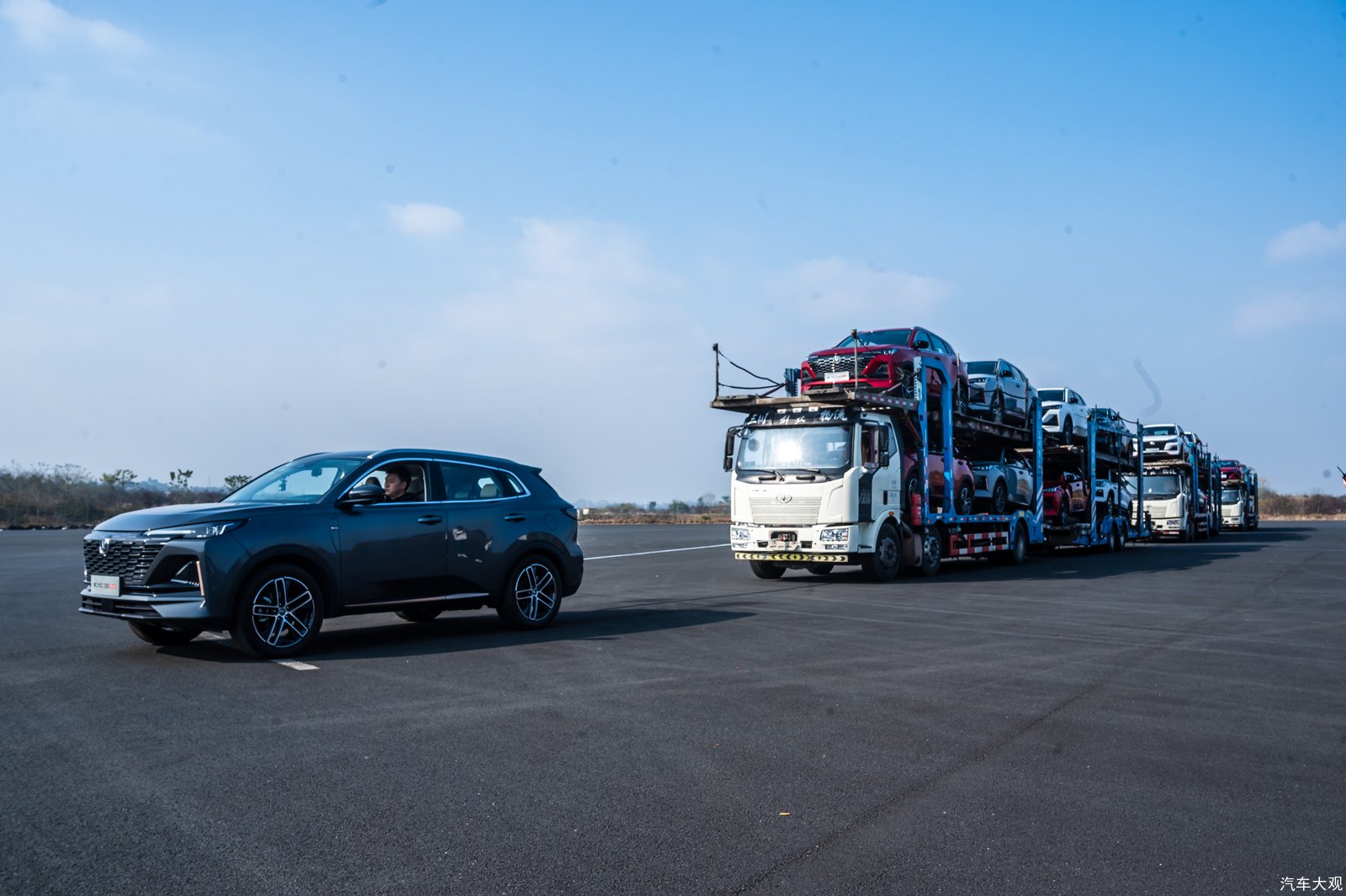 随后,第二代CS55PLUS又在重庆西部汽车试验场向第二项任务发起挑战,成功拉动三辆满载24辆汽车,总重超过90吨的拖挂式汽车运输车,用眼见为实的成绩,验证了蓝鲸发动机和蓝鲸变速器的极致性能。