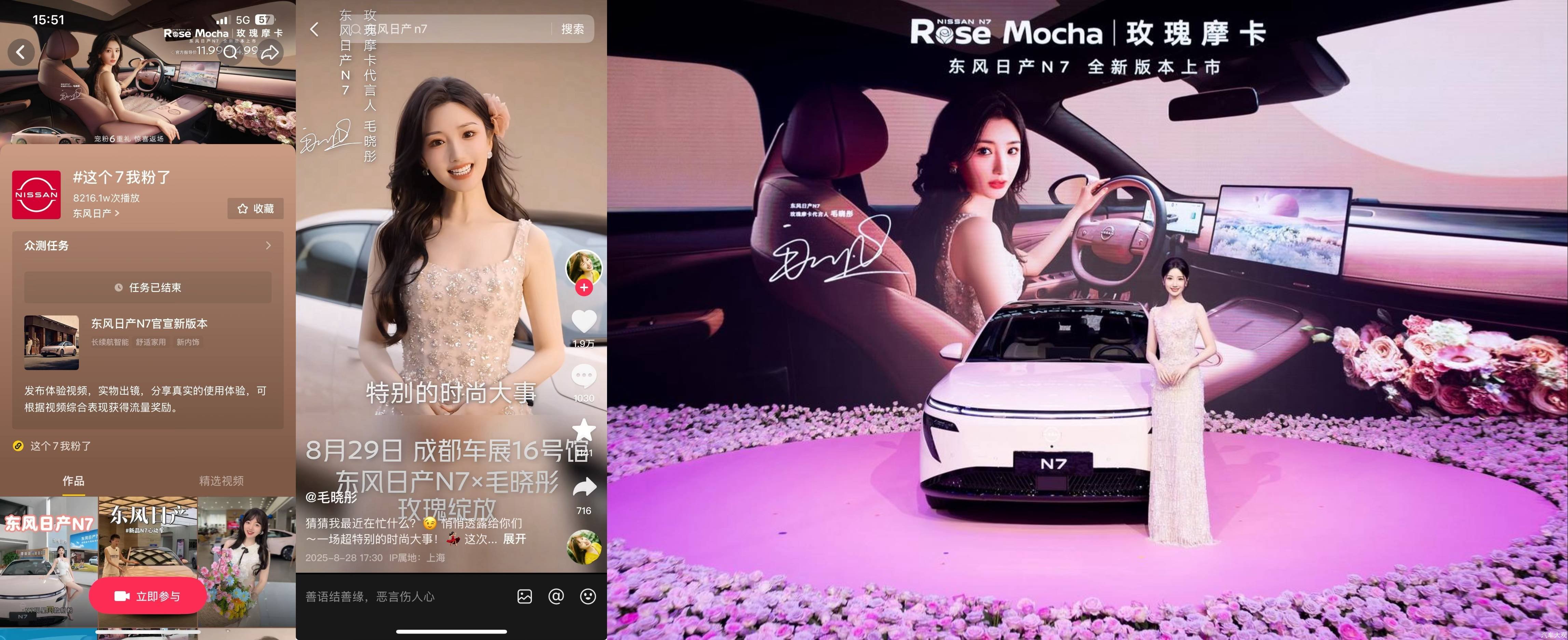 东风日产N7在成都车展上正式官宣了全新版本“玫瑰摩卡”。品牌通过“DOUCAR城市派对”IP合作明星@毛晓彤 担任代言人,定制拍摄KV和TVC,并空降车展现场活动,毛晓彤在4万朵玫瑰营造出的浪漫花海中明媚动人,与燕麦米车色的N7相得益彰,营造出时尚浪漫的氛围体验,既满足了用户对 “时尚外观” 的关注,又快速建立新品的 “潮流标签”,让新车亮相惊艳加倍。同时在线上,品牌携手IP共创话题#这个7我粉了,通过众测任务、达人合作等形式,成功为新品上市造势。