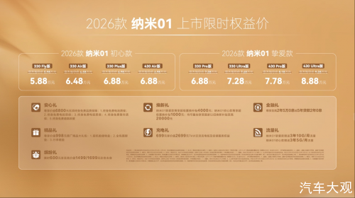除了产品力本身,2026 款纳米 01 还推出了 “七重大礼”,从购车、用车、售后等多个维度为用户保驾护航,彻底打消用户的 “后顾之忧”,让 “轻松购车、安心用车” 成为现实。