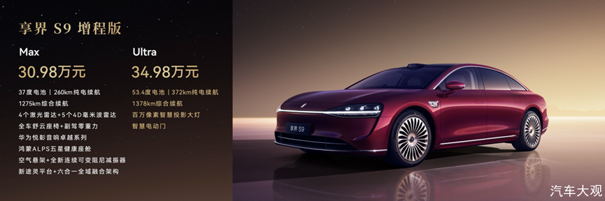 2025年11月20日,在鸿蒙智行 享界S9新品发布会上,旗舰9系享界S9正式上市。作为鸿蒙智行年度压轴新品,新款享界S9全面搭载华为旗舰顶配科技,豪华之上悦启新境。升级搭载全新华为途灵平台、华为乾崑智驾ADS 4、全新智慧电动门、全新星云尾灯、鸿蒙ALPS健康座舱、后排零重力座椅、华为百万像素智慧投影大灯、华为悦彰音响卓越系列等,以越境的豪华、智慧、性能、安全体验,全面满足用户商务社交、家庭出行、城市休闲等场景,实现更瞩目、更从容、更悦享的出行体验,引领豪华轿车价值跃迁。