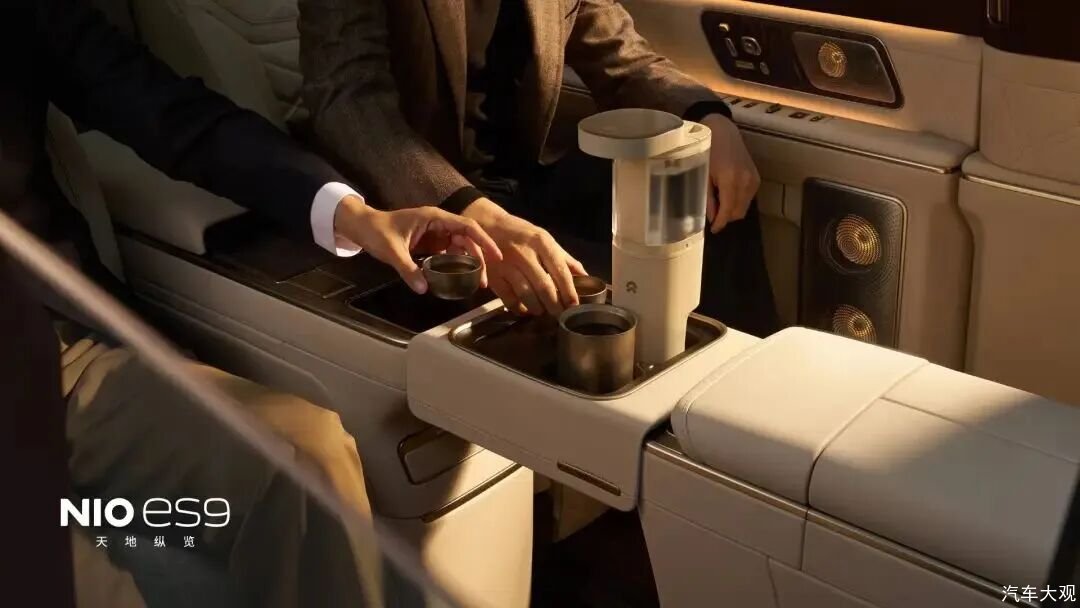 尊贵又带着脑洞的细节,是大家津津乐道的地方。为了伺候好各位老板,蔚来把能在车厢里做的文章基本都做绝了。一个例子,ES9 后排的中岛特地设计了一个可以卡在中间的磁吸茶台模块。茶杯可以通过磁吸稳固在台面,茶台四周留了漏水槽,废茶水倒上去会直接流进下方的积水盘,下方配了一个2200W的220V插座,刚好够用来插一个车载烧水壶。
