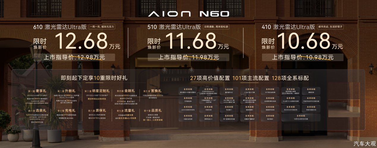 4月28日,埃安全新力作——N60正式上市,售价区间10.98-12.98万元,限时焕新价低至10.68万元起。新车共推出三个版本,配置完全一致,区别仅在于续航——这意味着,无论你选哪个版本,都能享受到同样的智驾、同样的舒适、同样的安全。