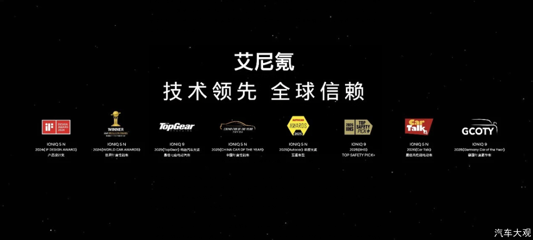 当然,现代汽车的全球电动化积累,也为艾尼氪 V(金星)提供支撑。现代汽车IONIQ 5和IONIQ 6分别于2022年、2023年获得“世界年度汽车”殊荣,2024年IONIQ 5 N获得“世界年度性能车”称号,自诞生以来,IONIQ系列累计销量突破100万辆,覆盖多个国家和地区。全球奖项和销量不能直接带来中国订单,但能说明艾尼氪(IONIQ)是现代汽车基于全球经验打造的电动化品牌。